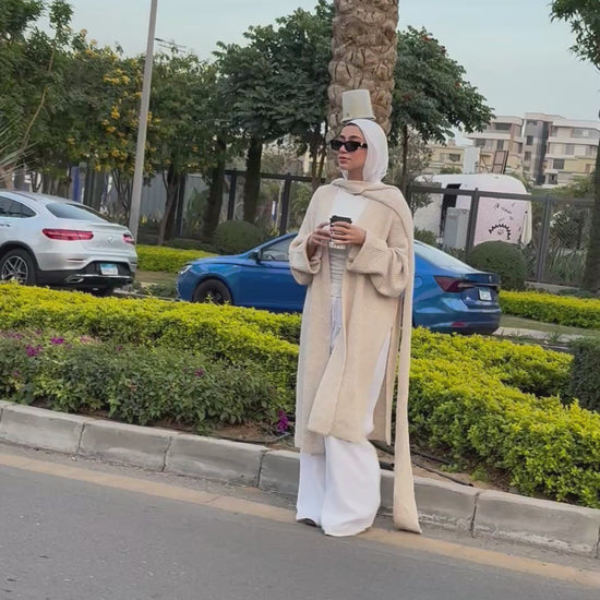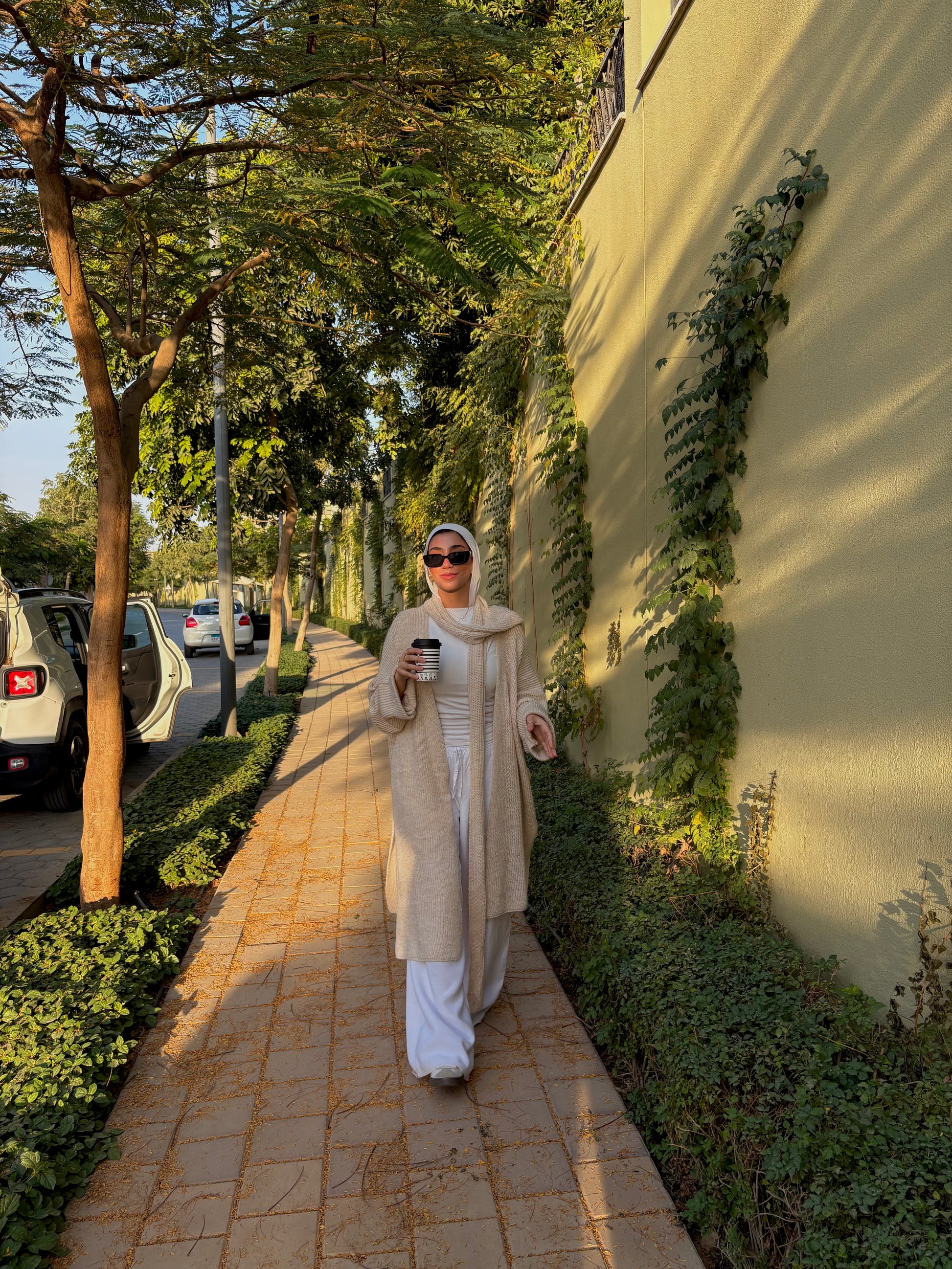 A layer of calm, softly resting on your shoulders. Layen, meaning softness and ease (اللين) is designed to bring you warmth without weight, elegance without effort. This cream set comes as two pieces: a relaxed-fit cardigan and a matching scarf, made to wrap you in comfort and grace for every gentle moment. One size fits most.